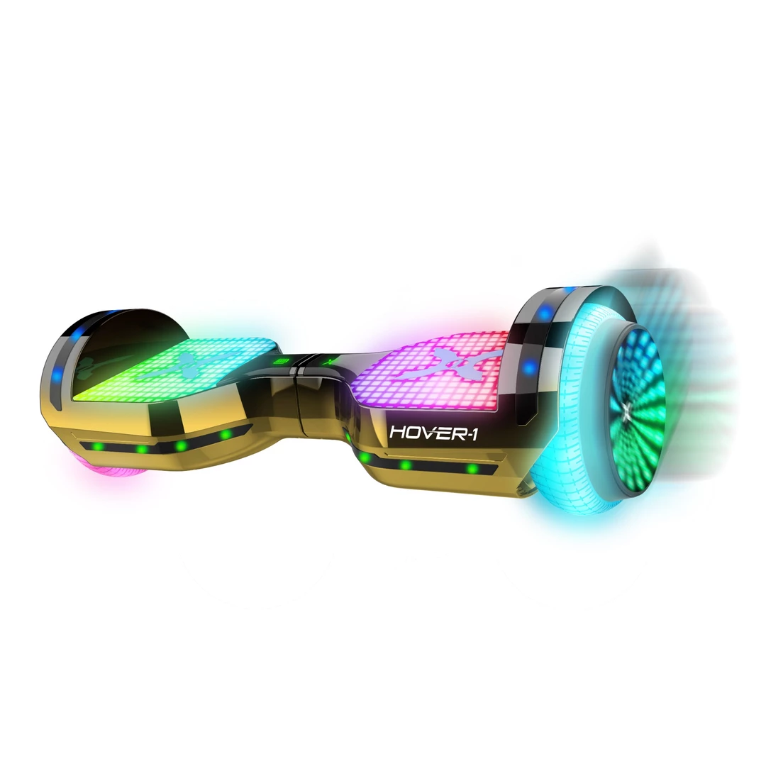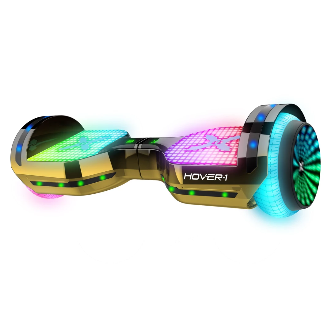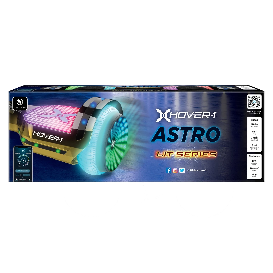 Ride big and ride bright with the Astro and its first of its kind, complete LED deck, exclusive to Hover-1™. Download the app to access the Bluetooth® speakers and set the RGB color scheme on the ultra-bright LED infinity wheels, board and foot pads. The powerful rechargeable Lithium-ion battery and 6.5 inch (17 cm) wheels enables the Astro to attain a top speed of up to 7 mph (11 kph) and a range up to 6 miles (9 km).* The Hover-1™ Astro is one of the most visually exciting hoverboards on the market today.