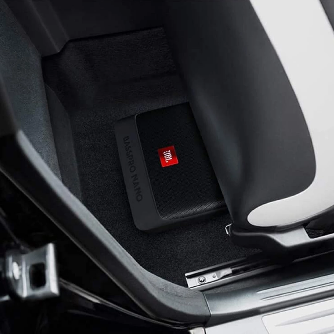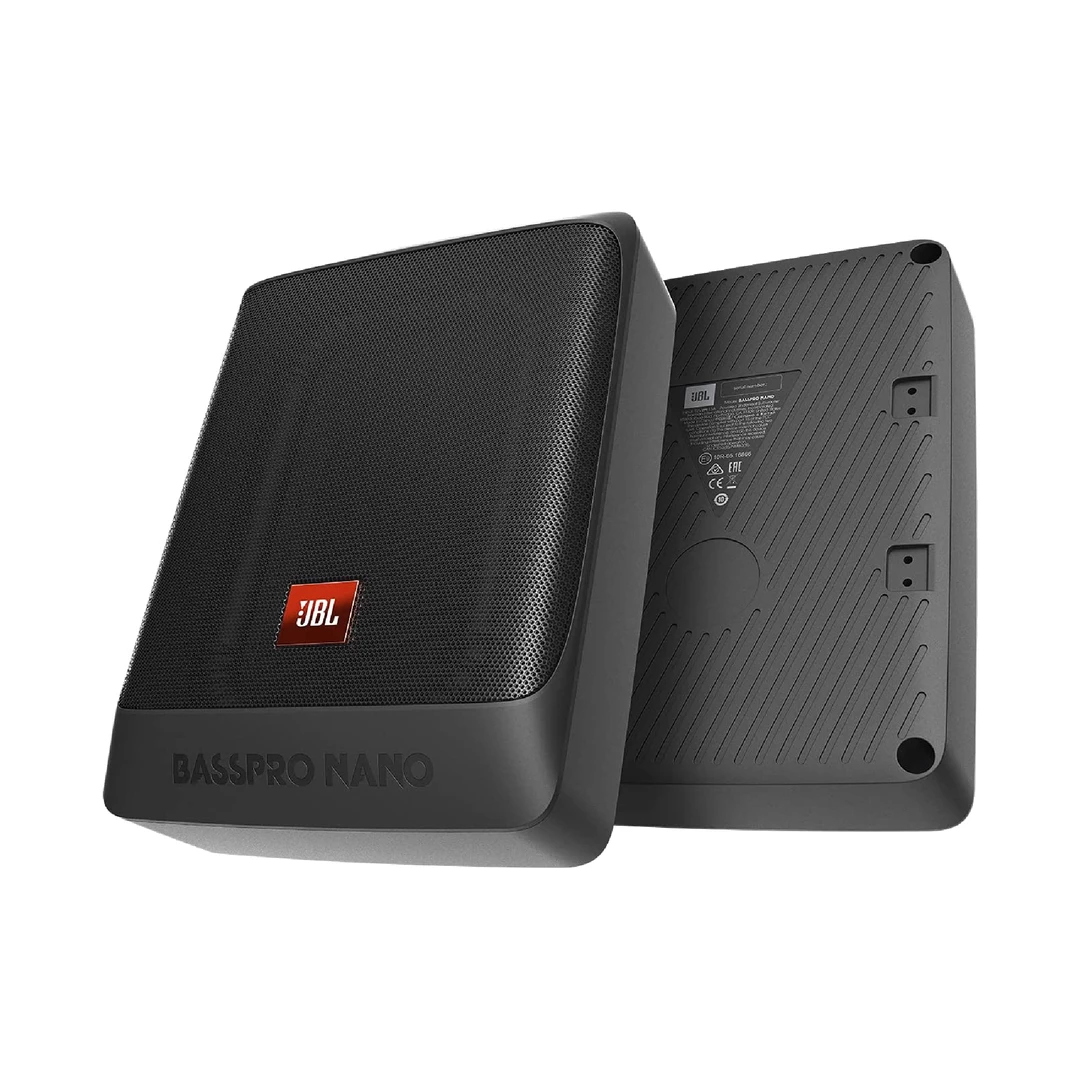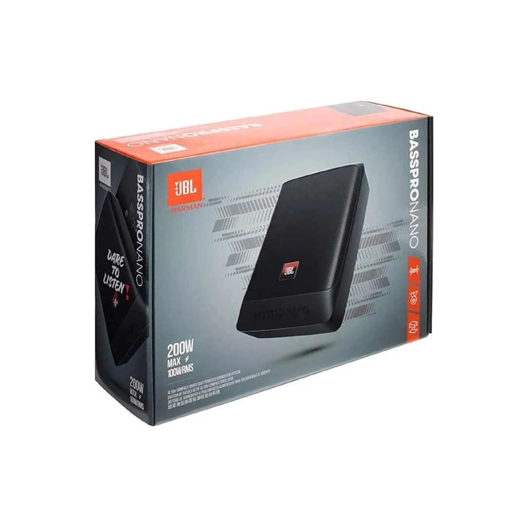 JBL BassPro Nano – 200 Watt Ultra-Compact Car Audio Under Seat Powered Subwoofer SystemBig Bass, Small Space JBL BassPro Nano delivers bumping bass and takes up little space. The on-board 100Wrms amplifier has been performance matched to subwoofer to deliver the amount of clear, tight bass. Intelligent Electronic Design for Reliable and Extraordinary Performance The BassPro Nano employs high-pass filters and limiters that deliver exceptional at-the-limits performance. Die-Casting Aluminum Enclosure Design The rugged all-die-cast aluminum enclosure design in anodized textured matte black not only minimizes size but also eliminates rattles to deliver clear bass from tiny space. Bass Volume Remote Control Bass Volume Remote control is included to let you adjust the sound from the driver’s seat. Specifications ·      Driver Complement: 6″ x 8″ (152mm x 203mm) Subwoofer ·      Amplifier Power: 100Wrms; 200W Max ·      Frequency Response: 30Hz – 150Hz ·      Fuse: 15A Maximum ·      Current Draw: 13A ·      Quiescent Current Draw: <600mA ·      Input Sensitivity: 0.1V – 4.0V Low-Level Input; 0.25V – 10V High-Level Input ·      Crossover Frequency: 50Hz – 150Hz Crossover Slope: 12dB/octave ·      Bass Boost: 0dB to + 12dB @ 50Hz ·      Dimensions (L x W x H): 10-1/4″ x 7-11/16″ x 2-15/16″     (260.0mm x 195.0mm x 74.6mm) ·      Weight: 7.78 lbs (3.53kg) What’s in the box ·      1x Under seat subwoofer ·      14x Screws ·      4x Small metal plate ·      1x Wiring harness ·      1x Bass volume remote control (with cable) ·      1x 15A Fuse |
