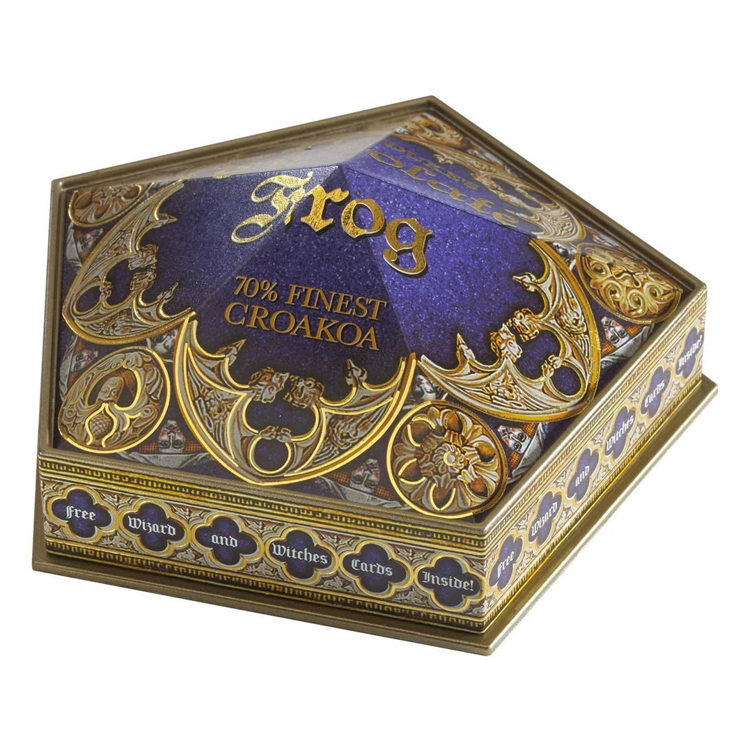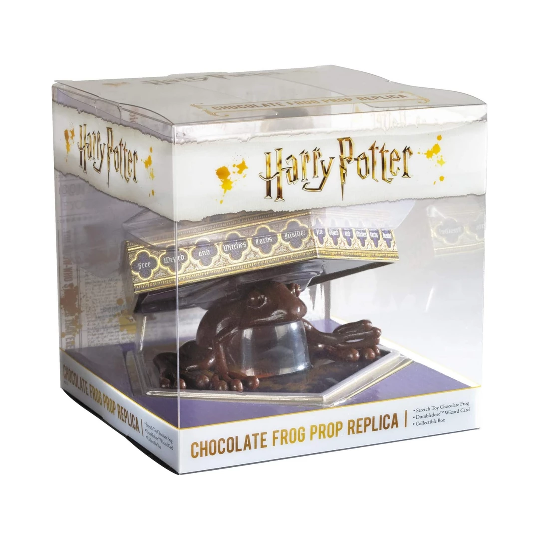 A squishy, stretchy chocolate frog replica inside an ornately decorated, pentagonal keepsake box, complete with Albus Dumbledore Famous Witches and Wizards Card. This replica won’t help with your chocolate fix – it’s non-edible!