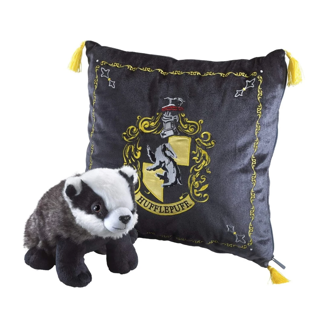 - YOUR VERY OWN HUFFLEPUFF COMPANION – Designed in the style of Hufflepuff house and inspired by the Harry Potter film series, this velvet-feel black cushion is embroidered with the Hufflepuff Crest and comes with a badger plush inspired by the Harry Potter film series’ Hufflepuff mascot.