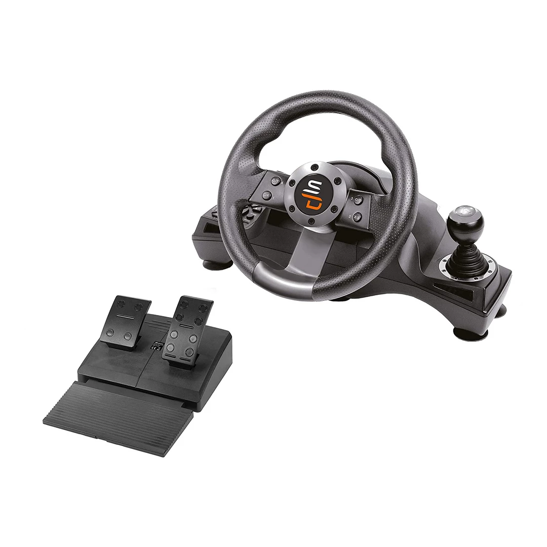 - A steering wheel with gear lever – The GS700 racing wheel is the racing simulation accessory designed to provide a more realistic racing experience. Designed for everyone, it features a gear lever, a dual vibration motor, and a non-slip pedal assembly that ensures optimum stability.